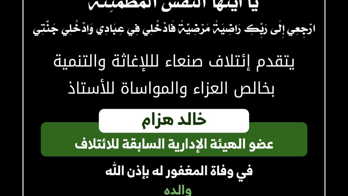 ببالغ الحزن وعظيم الأسى، يعزي ائتلاف صنعاء للإغاثة والتنمية الاستاذ خالد هزام عضو الهيئة الإدارية السابقة للإئتلاف في وفاة المغفور له بإذن الله والده.